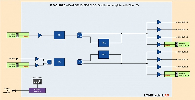 2-х канальный 3Гбит SDI/ASI усилитель-распределитель с оптовоконным входом/выходом