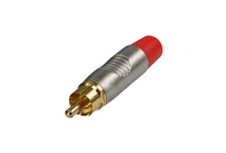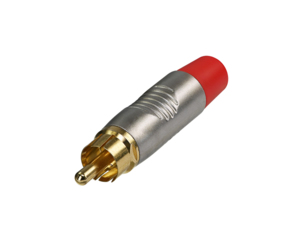 кабельный разъём RCA "папа", металлический корпус серебристого цвета, позолоченные контакты, резиновый хвостовик красного цвета