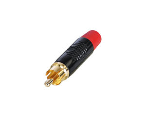 кабельный разъём RCA "папа", металлический корпус чёрного цвета, позолоченные контакты, резиновый хвостовик красного цвета