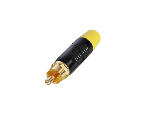 кабельный разъём RCA "папа", металлический корпус чёрного цвета, позолоченные контакты, резиновый хвостовик жёлтого цвета