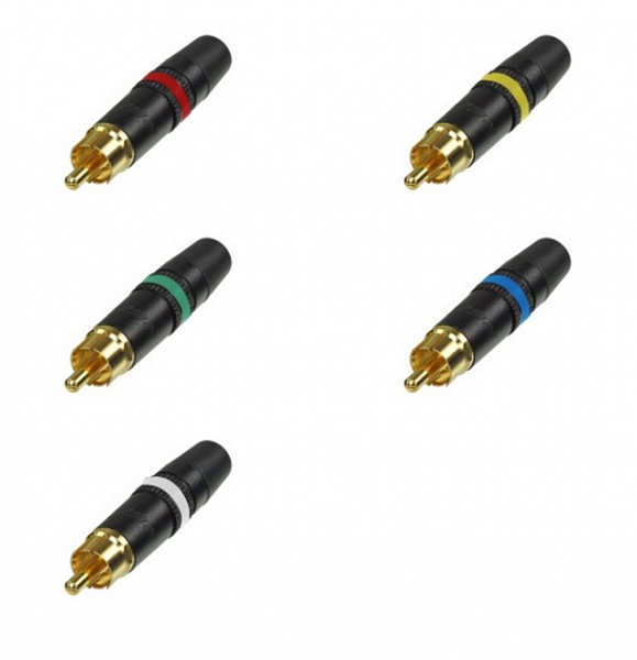 кабельный разъём RCA "папа", металлический корпус, позолоченные контакты, маркировочные кольца 6-ти цветов: чёрный, синий, зелёный, красный, жёлтый и белый
