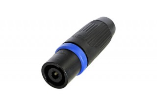 Кабельный разъем SPEAKON для подключения громкоговорителей / усилиптелей, туровое применение, 4-х контактный <штекер/папа>, прочный черный-хромированный металлический корпус, класс защиты (IP 54), надежная фиксация блокировки, контакты - покрытие серебро, под пайку, зажимной патрон, черный колпачок, подходит для проводов сечением до 6.0 мм2 (AWG 10), рабочее напряжением 250 В / ток 40 А, на кабель диаметром (9.0-16.0 мм).