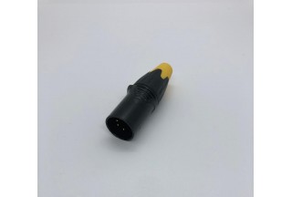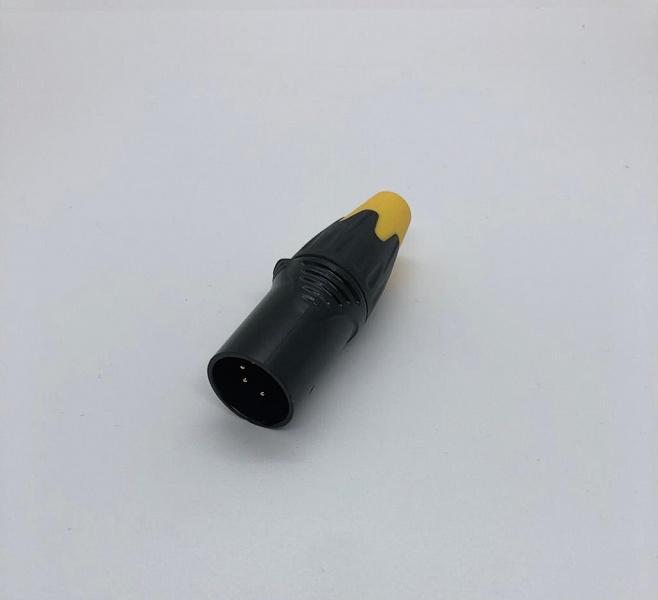 Кабельный разъем XLR, 5-и контактный <штекер/папа>, А-серия, черный металлический корпус, контакты - покрытие золото, под пайку, зажимной патрон, черно-желтый хвостовик (доступно 2- цвета, красный и черный), на кабель диаметром до 8.0 мм