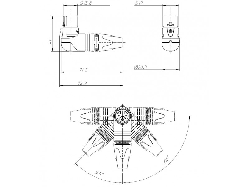 3-х пиновый угловой разъём XLR "мама", серии "RX". Возможны 5 вариантов подвода кабеля.