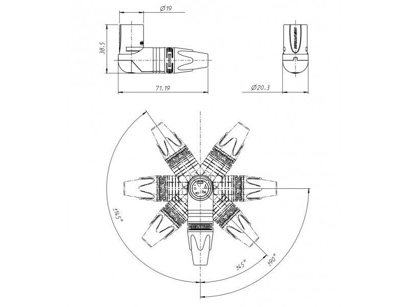 4-х пиновый угловой разъём XLR "папа", серии "RX". Возможны 7 вариантов подвода кабеля.