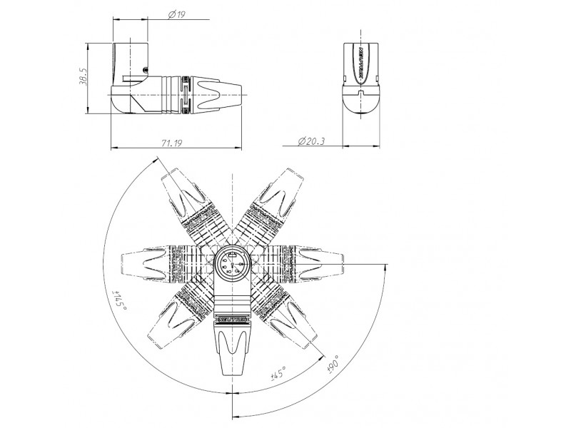 6-ти пиновый угловой разъём XLR "папа", серии "RX". Возможны 7 вариантов подвода кабеля.