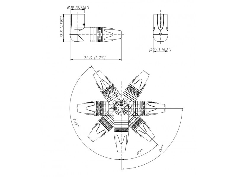 7-ми пиновый угловой разъём XLR "папа", серии "RX". Возможны 7 вариантов подвода кабеля.