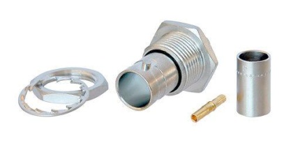 Панельный (приборный) разъём BNC, под обжим. Изолированный, "безфланцевый".Используется с проводами Belden 1505A, Belden 8241F, Canare L4CFB, CommScope 5565, Draka 0.8/3.7 AF, Draka 755-801 (803, 804), Gepco VPM2000, Suhner S04263, Sommer 600-0451