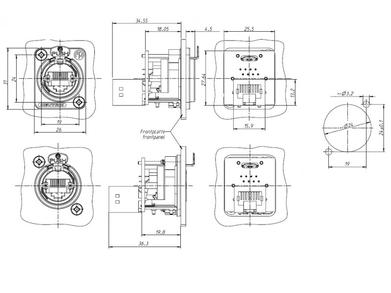 панельный проходной разъём etherCON, фланец D типа. Cat. 5E.