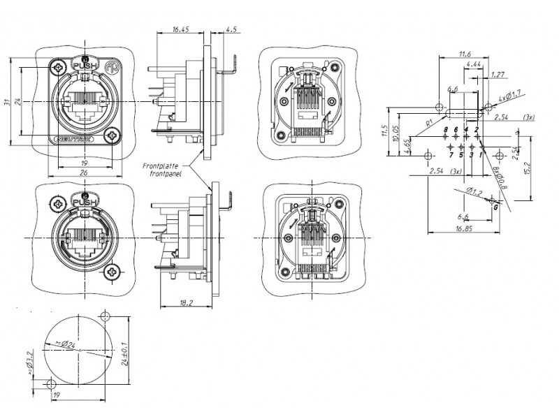 Соответствует стандартам TIA/EIA 568B и ISO/IEC 11801 . Для использования в LAN соединениях ( EtherNET ) , RJ45 / 8P8C . Устанавливается в панель . Прочный металлический корпус . Контактная группа только для вертикального / печатного монтажа . Кнопка-фиксатор позволяет надежно удерживать контактирующий с ним кабель / патч корд . Заземление на корпус .