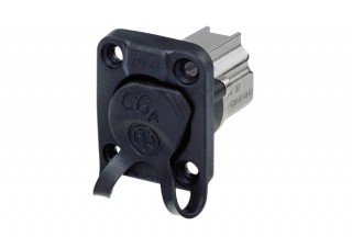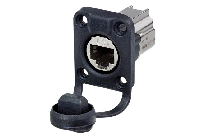 панельный проходной разъем RJ-45 CAT 6A, фланец D-типа, с резиновым уплотнителем, степень гидро-пылезащиты IP67. Экранированный, корпус никелированный.