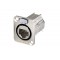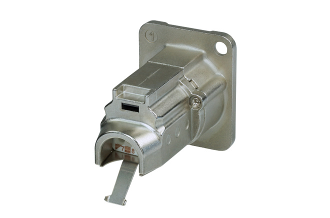 панельный разъем RJ-45 CAT 6A, фланец D-типа. Экранированный,терминация IDC, корпус никелированный.