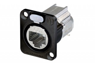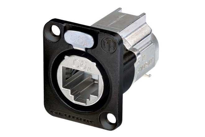 панельный разъем RJ-45 CAT 6A, фланец D-типа. Экранированный,терминация IDC, черный корпус.