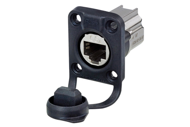 панельный разъем RJ-45 CAT 6A, фланец D-типа, с резиновым уплотнителем, степень гидро-пылезащиты IP67. Экранированный,терминация IDC, корпус никелированный.