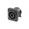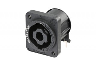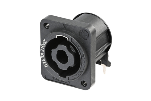 Панельный разъем SPEAKON серии XX, для подключения громкоговорителей / усилителей, 2-х контактный <штекер/папа>, прочный корпус из термопластика, фланец D-типа, самонарезные отверстия для винтов (винтовые), горизонтальная установка PCB, надежная поворотная система блокировки, оптимизироавн для использования в динамиках, контакты - покрытие серебро, рабочее напряжение 250 В / ток 25 А, под пайку, соответствует стандарту IEC 62368-1. Не совместим с кабельными 4-х контактными разъемами SPEAKON.