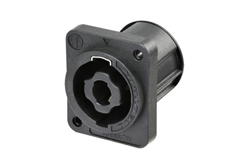 Панельный разъем SPEAKON серии XX, для подключения громкоговорителей / усилителей, 4-х контактный <штекер/папа>, черный корпус из термопластика, фланец D-типа, самонарезные отверстия для винтов (винтовые) - зеркальное расположение, вертикальная установка PCB, надежная поворотная система блокировки, оптимизироавн для использования в динамиках, контакты - покрытие серебро, рабочее напряжение 250 В / ток 25 А, под пайку, соответствует стандарту IEC 62368-1.