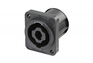 Панельный разъем SPEAKON серии XX, для подключения громкоговорителей / усилителей, 4-х контактный <штекер/папа>, черный корпус из термопластика, фланец D-типа, самонарезные отверстия для винтов (винтовые), вертикальная установка PCB, надежная поворотная система блокировки, оптимизироавн для использования в динамиках, контакты - покрытие серебро, рабочее напряжение 250 В / ток 25 А, под пайку, соответствует стандарту IEC 62368-1.