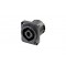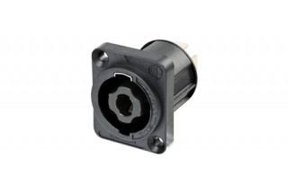 Панельный разъем SPEAKON для подключения громкоговорителей / усилителей, 4-х контактный <штекер/папа>, черный корпус из термопластика, фланец D-типа, утопленые сквозные отверстия, плоские контакты 1/4", надежная поворотная система блокировки, оптимизироавн для использования в динамиках, контакты - покрытие серебро, рабочее напряжение 250 В / ток 40 А, под пайку.