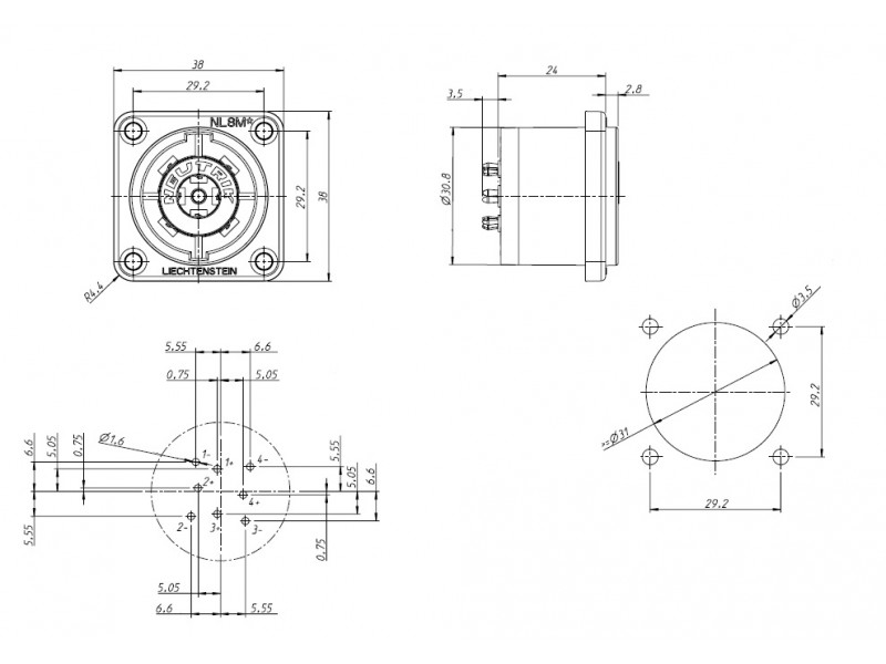 8-ми контактный панельный разъём speakON "папа". Чёрный пластиковый фланец "G" типа в металлической никелированной рамке.
