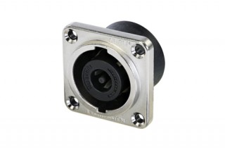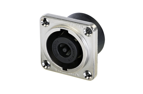Панельный разъем SPEAKON для подключения громкоговорителей / усилителей, 8-и контактный <штекер/папа>, черный корпус из термопластика, металлический квадратный фланец G-типа, сквозные отверстия, вертикальная установка PCB, надежная поворотная система блокировки, оптимизироавн для использования в динамиках, контакты - покрытие серебро, рабочее напряжение 250 В / ток 30 А, под пайку.