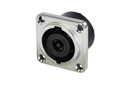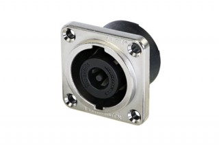 Панельный разъем SPEAKON для подключения громкоговорителей / усилителей, 8-и контактный <штекер/папа>, черный корпус из термопластика, квадратный металлический фланец G-типа, сквозные отверстия, плоские контакты 3/16 ", надежная поворотная система блокировки, оптимизироавн для использования в динамиках, контакты - покрытие серебро, рабочее напряжение 250 В / ток 40 А, под пайку.
