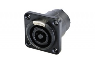 Панельный разъем SPEAKON для подключения громкоговорителей / усилителей, туровое применение, 4-х контактный <гнездо/мама>, прочный влагостойкий черный-хромированный металлический корпус, фланец G-типа, класс защиты (IP 54), контакты - покрытие серебро, подходит для проводов сечением до 6.0 мм2 (AWG 10), рабочее напряжение 250 В / ток 40 А, под пайку.