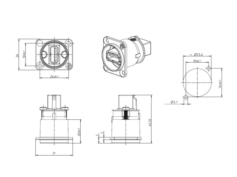 проходной USB разъём. Версия USB 2.0. Взаимозаменяемый A/B. Фланец "D" типа.