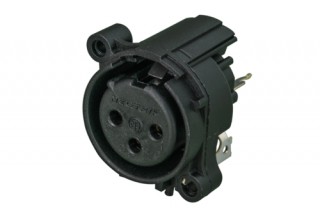 Панельный разъем XLR, 3-х контактный <гнездо/мама>, АА-серия, фланец А-типа, вертикальная установка PCB, пластиковый корпус, заземление: контакт 1 - на массу и на корпус ответного разъема, удерживающая пружина вместо защелки, контакты - покрытие золото, под пайку.