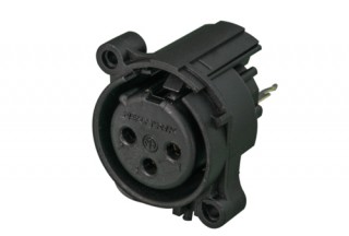 Панельный разъем XLR, 3-х контактный <гнездо/мама>, АА-серия, фланец А-типа, вертикальная установка PCB, пластиковый корпус, заземление: без заземляющего контакта, удерживающая пружина вместо защелки, контакты - покрытие золото, под пайку.