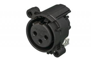 Панельный разъем XLR, 3-х контактный <гнездо/мама>, А-серия, фланец А-типа, горизонтальная установка PCB, компактный пластиковый корпус, заземление: контакт 1 - на массу и на корпус ответного разъема, удерживающая пружина вместо защелки, контакты - покрытие золото, под пайку.