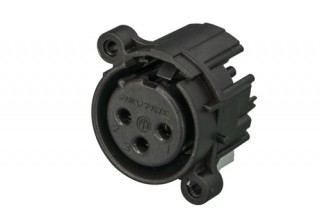 Панельный разъем XLR, 3-х контактный <гнездо/мама>, А-серия, фланец А-типа, боковая левая установка PCB, компактный пластиковый корпус, заземление: контакт 1 - на массу и на корпус ответного разъема, удерживающая пружина вместо защелки, контакты - покрытие золото, под пайку.