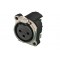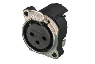 Панельный разъем XLR, 3-х контактный <гнездо/мама>, B-серия, металлический фланец А-типа, дополнительная защита от RF, горизонтальная установка PCB, компактный пластиковый корпус, заземление: отдельный контакт заземления соединен с корпусом разъема и заземлением панели установки, контакты - покрытие золото, под пайку.