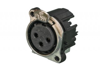 Панельный разъем XLR, 3-х контактный <гнездо/мама>, B-серия, металлический фланец А-типа, дополнительная защита от RF, боковая левая установка PCB, компактный пластиковый корпус, заземление: контакт 1 - на массу и на корпус ответного разъема, контакты - покрытие золото, под пайку.
