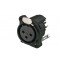 Панельный разъем XLR, 3-х контактный <гнездо/мама>, B-серия, черный металлический фланец А-типа, дополнительная защита от RF, вертикальная установка PCB, компактный пластиковый корпус, заземление: отдельный контакт заземления соединен с корпусом разъема и заземлением панели установки, контакты - покрытие золото, под пайку.