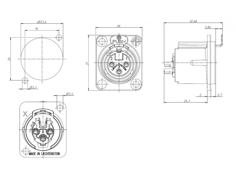 3-х пиновый панельный разъём XLR "мама". Никелированный фланец "D" типа. Повышенная защита от радиоизлучения.