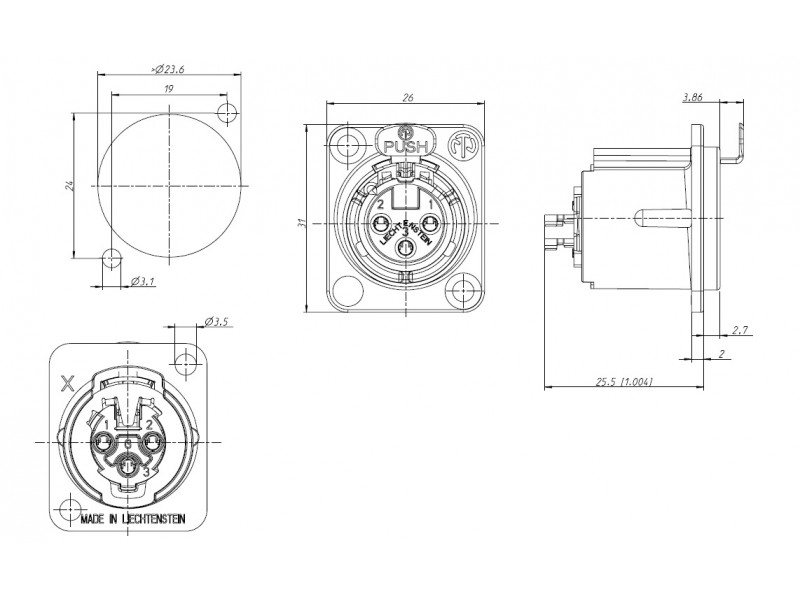 3-х пиновый панельный разъём XLR "мама". Контакты под обжим. Никелированный фланец "D" типа. Повышенная защита от радиоизлучения.