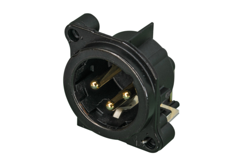 Панельный разъем XLR, 3-х контактный <штекер/папа>, B-серия, черный хромированный металлический фланец А-типа, дополнительная защита от RF, горизонтальная установка PCB, компактный корпус из термопластика, заземление: отдельный контакт заземления соединен с корпусом разъема и заземлением панели установки, контакты - покрытие золото, под пайку.