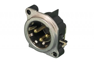 Панельный разъем XLR, 3-х контактный <штекер/папа>, B-серия, металлический фланец А-типа, дополнительная защита от RF, горизонтальная установка PCB, компактный корпус из термопластика, заземление: отдельный контакт заземления соединен с корпусом разъема и заземлением панели установки, 5 дополнительных контактов заземления, контакты - покрытие золото, под пайку.