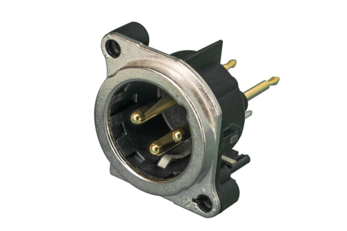 Панельный разъем XLR, 3-х контактный <штекер/папа>, B-серия, металлический фланец А-типа, дополнительная защита от RF, вертикальная установка PCB, корпус из термопластика, заземление: контакт заземления соединен с корпусом, но не соединен с контактом 1, контакты - покрытие золото, под пайку.