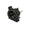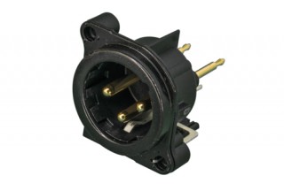 Панельный разъем XLR, 3-х контактный <штекер/папа>, B-серия, черный хромированный металлический фланец А-типа, дополнительная защита от RF, вертикальная установка PCB, компактный корпус из термопластика, заземление: отдельный контакт заземления соединен с корпусом разъема и заземлением панели установки, контакты - покрытие золото, под пайку.