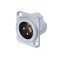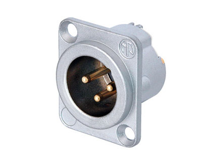 3-х пиновый панельный разъём XLR "папа" серии "DLX". Никелированный корпус, золотые контакты. Фланец "D" типа. Повышенная защита от радиоизлучения.