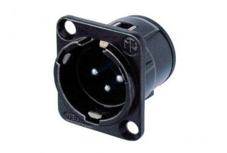 Панельный разъем XLR, 3-х контактный <штекер/папа>, D-серия, фланец D-типа, вертикальная установка PCB, черный хромированный металлический никелированный корпус, контакты - покрытие серебро, под пайку.