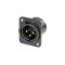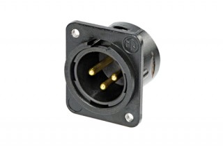 Панельный разъем XLR, 3-х контактный <штекер/папа>, DL-серия, фланец D-типа, черный хромированный металлический корпус, контакты - покрытие золото, монтажные отверстия M3, под пайку.
