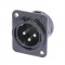 Панельный разъем XLR, 3-х контактный <штекер/папа>, DL-серия, фланец D-типа, черный хромированный металлический корпус, контакты - покрытие серебро, монтажные отверстия M3, под пайку.