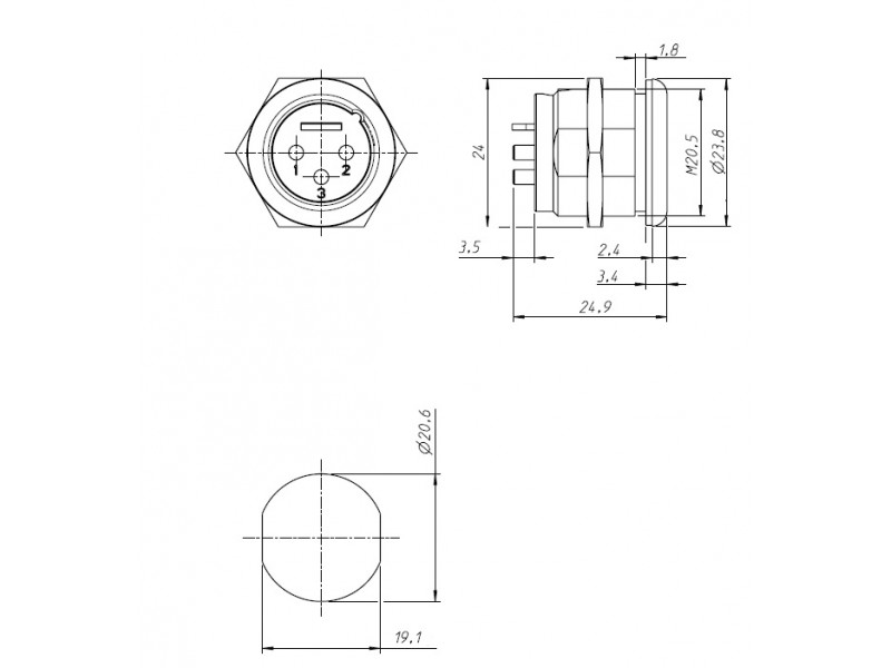 3-х пиновый панельный разъём XLR "папа". Безфланцевый. Золотые контакты. Крепление под отверстие диаметром 20.5мм. Идеален при организации "внешней" коммутации. При коммутировании с разъёмами серии "HD" (NC3FXX-HD-x) обеспечивается защита класса IP65.