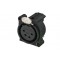Панельный разъем XLR, 4-х контактный <гнездо/мама>, А-серия, фланец А-типа, горизонтальная установка PCB, компактный корпус из термопластика, заземление: отдельный контакт заземления - корпус разъема - корпус установки соединены, возможна цветовая маркировка, контакты - покрытие золото, под пайку.
