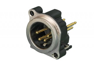 Панельный разъем XLR, 4-х контактный <штекер/папа>, B-серия, металлический фланец А-типа, дополнительная защита от RF, вертикальная установка PCB, компактный корпус из термопластика, заземление: отдельный контакт заземления - корпус разъема - корпус установки соединены, контакты - покрытие золото, под пайку.