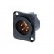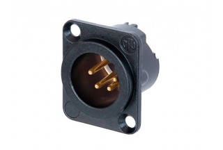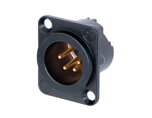 Панельный разъем XLR, 4-х контактный <штекер/папа>, DLX-серия, фланец D-типа, черный компактный хромированный металлический корпус с двойным заземляющим контактом, обеспечивающий отличную защиту от RF, контакты - покрытие золото, под пайку.