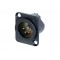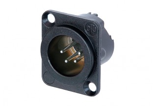 Панельный разъем XLR, 4-х контактный <штекер/папа>, DLX-серия, фланец D-типа, черный компактный хромированный металлический корпус с двойным заземляющим контактом, обеспечивающий отличную защиту от RF, контакты - покрытие серебро, под пайку.