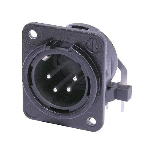 Панельный разъем XLR, 4-х контактный <штекер/папа>, DL-серия, фланец D-типа, горизонтальная установка PCB, черный хромированный металлический корпус, контакты - покрытие золото, монтажные отверстия M3, под пайку.
